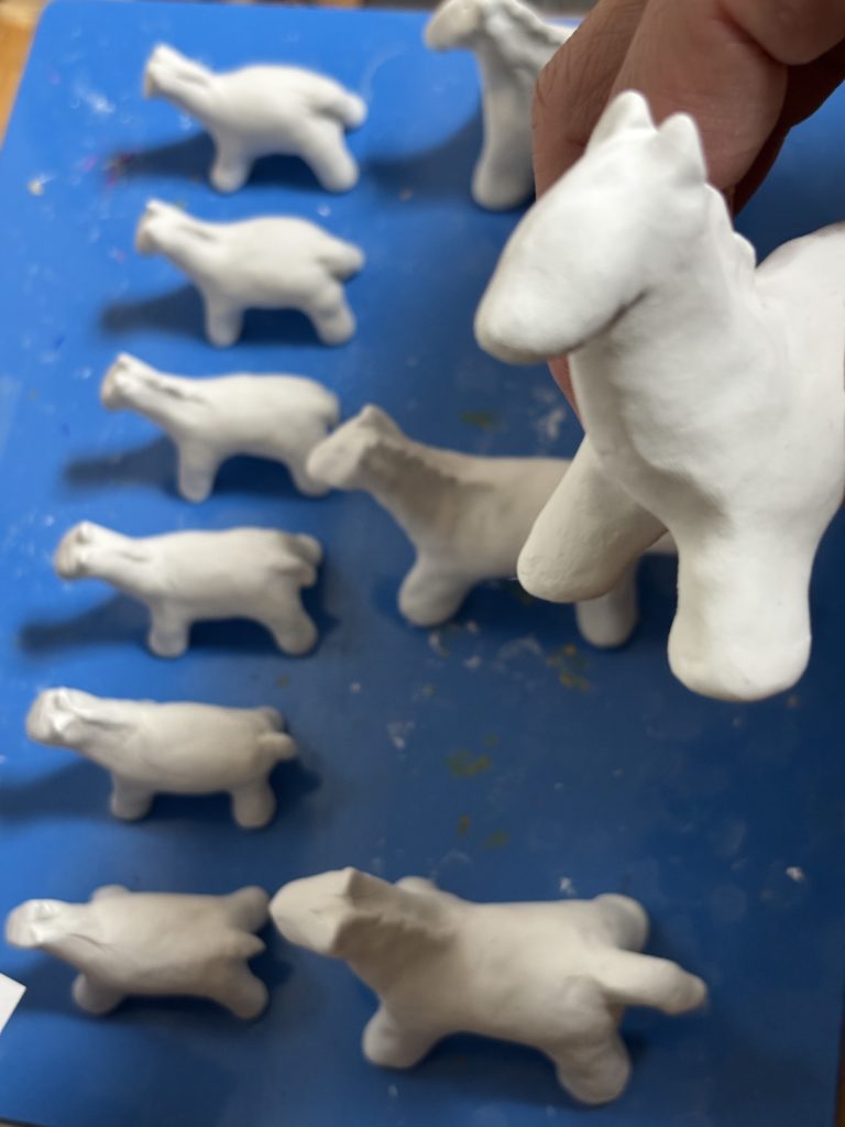 更に粘土人形づくりを再開。どうやら、最初にお試しでつくったアンティーク風の黒い馬が人気のようで、そちらをまたつくることにしたみたい。