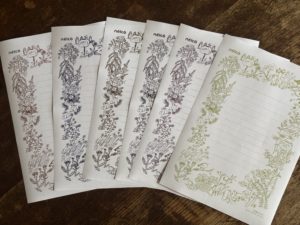 予約が必要で少人数でじっくり一緒にお茶しながらやる企画もあるのですが、気軽に参加できる体験としては、nëlcöの在廊時にのみできる、封筒や、便箋・カードづくりもあります。