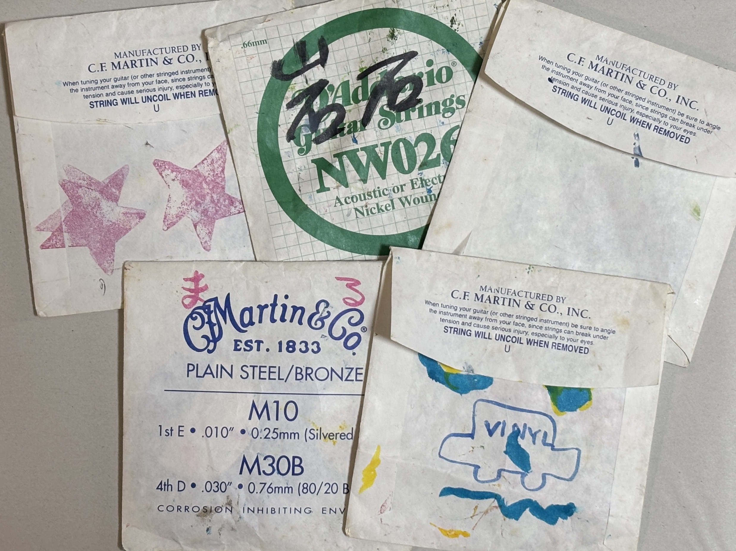 (ギターの弦は丸く巻かれて封筒みたいな紙袋に入っていることが多く、袋のデザインが可愛いのでnëlcöはこの袋も大事に集めたり、活用したりしています。この袋とても好きなので、ギタリストのみなさんはぜひ捨てずにとっておいて、nëlcöにください。)